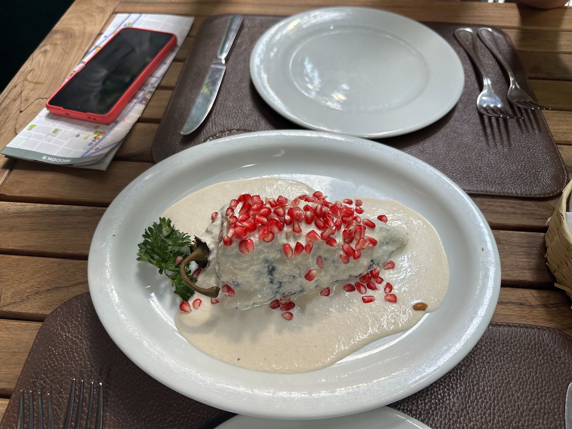 While walking around, we found a restaurant that had a special, this amazing dish called, Chiles de Nogada. I remember hearing a program on News in Slow Spanish about it, and I really wanted to try it. The dish is all the colors of the Mexican flag.